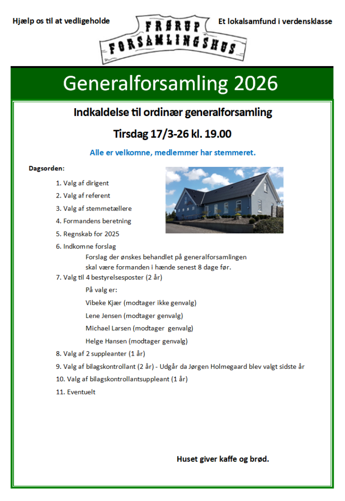 Hermed indkaldelse til årets generalforsamling i Frørup Forsamlingshus.